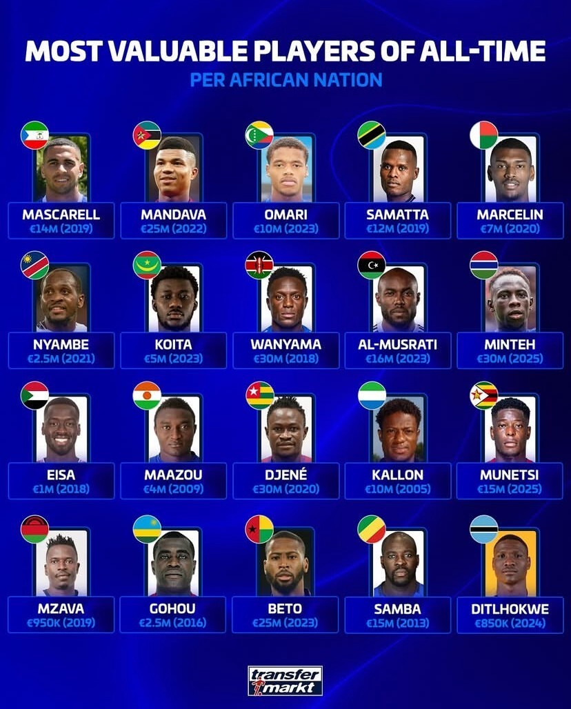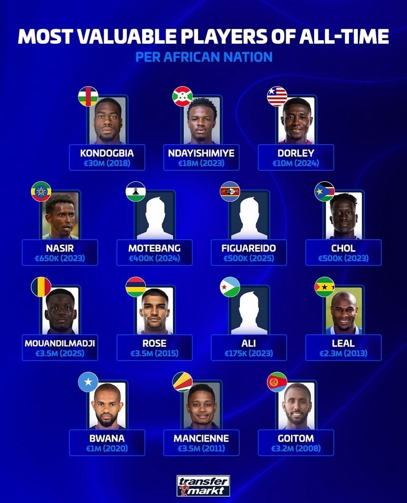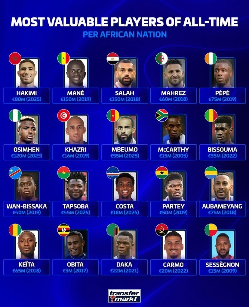 北京时间10月14日,德转统计出了非洲各国球员历史的最高身价,埃及的萨拉赫与塞内加尔的马内身价都曾经达到1.5亿欧元高居第一,奥斯梅恩1.2亿欧元排名第三。